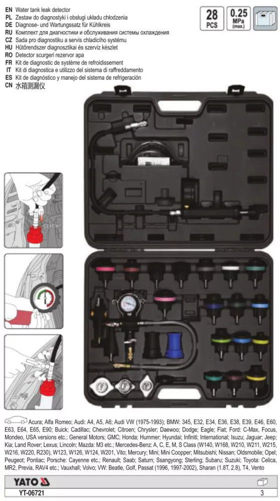 • Alkalmazás: A gépjárművek hűtőrendszereinek nyomáspróbájához és szivárgásainak ellenőrzéséhez szolgál